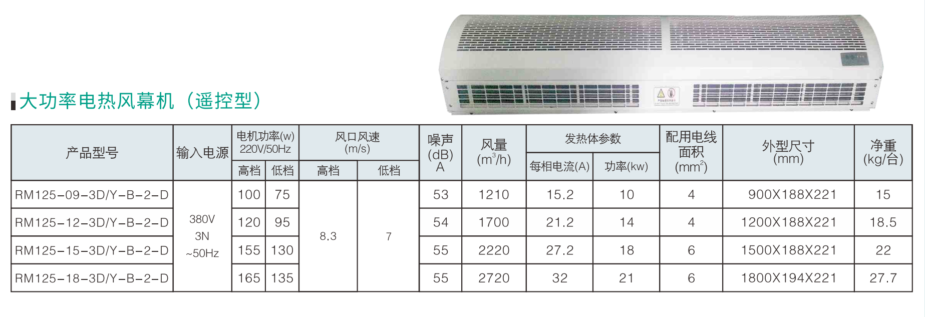 绿岛风常规贯流式电加热风幕机型号:RM125-09-D/Y-B-2-X,RM125-12-D/-B-2-X,RM125-15-D/Y-B-2-X,RM125-09-3D/Y-B-2-D,RM125-12-3D/Y-B-2-D,RM125-15-3D/Y-B-2-D,RM125-18-3D/Y-B-2-D